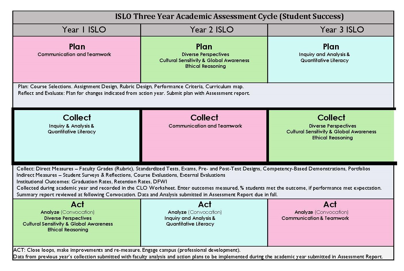 The links below include past institutional assessment activities, the current assessment cycle, the repsonsible committees for overseeing assessment processes, definitions of Institutional Student Learning Outcomes and current and past institutional success indicators as reported by the department of Institutional Research and the National Survey.