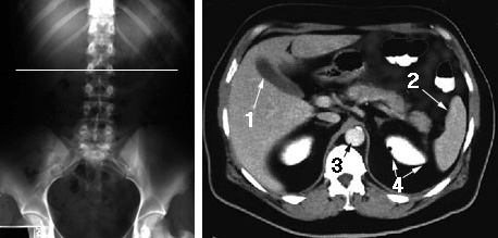 The CT image dramatically demonstrates organs and tissues that are all similar shades of gray on the radiograph. No. 1 is the gallbladder surrounded by the liver; No. 2 is the spleen; No. 3 is the abdominal aorta; and No. 4 is the upper pole of the left kidney.