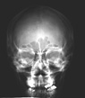 The radiograph of the human skull (shown at left) was taken using the conventional method discovered over 100 years ago. X-rays, created in the x-ray tube, pass through the body part and strike a photographic film. The film is loaded in a cassette, between two fluorescent screens. The screens glow when x-rays strike them, and expose the film in the same manner as all photographic film is exposed.