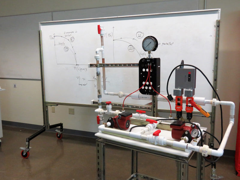 Students can experiment with thermodynamic principles, fluid circulation efficiency, and systems designed for solar applications. Students will use these tools to evaluate thermal and electric loads of buildings and investigate facility processes. Building systems including lighting, hot water, heating and ventilation, central plant systems, industrial refrigeration and motors are considered for redesign to improve efficiency. This lab also offers the opportunity for students to learn energy use management through instrument and controls. Students will experience energy auditing, renewable systems economic analysis, and maintenance strategies for reducing energy use.