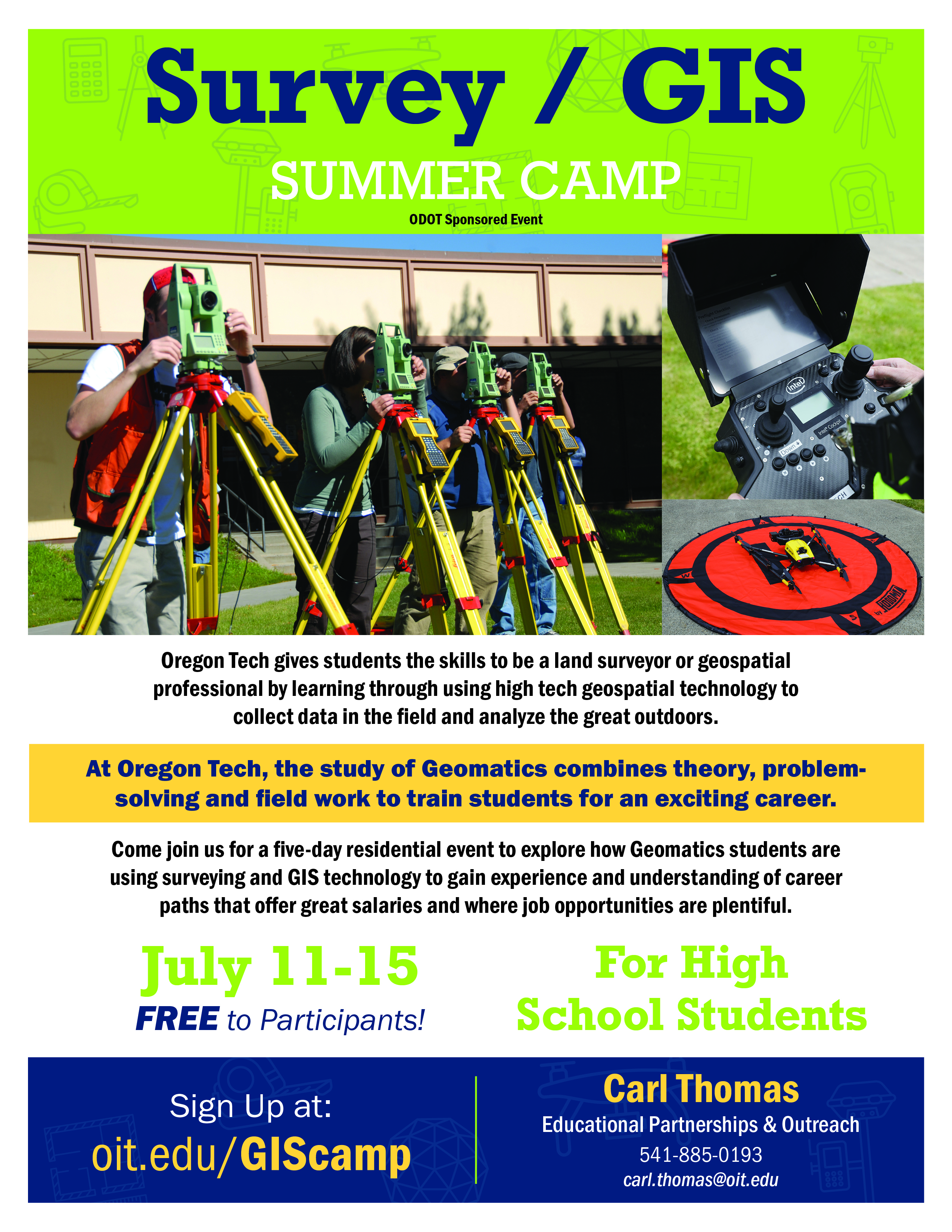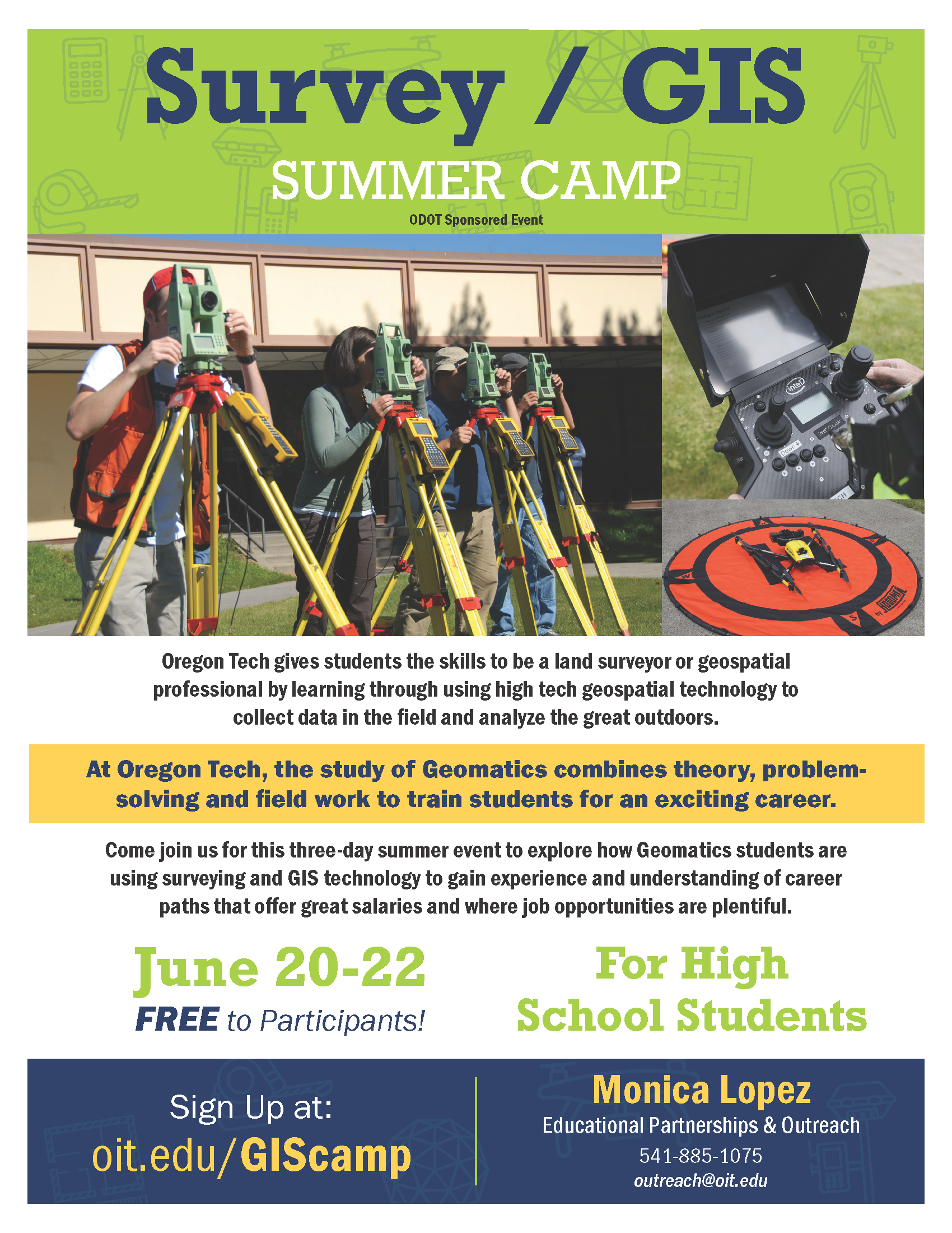 Due to the generous support of the Oregon Department of Transportation (ODOT) the GIS Summer Camp is free to all participants, including tuition, fees, and food.
