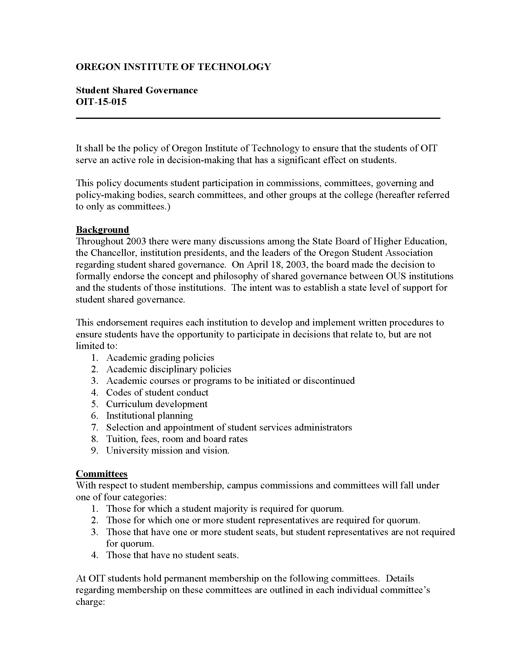 The Student Shared Governance policy at Oregon Tech ensures that students have a formal voice in important decisions that affect their education and campus life. It gives students the right to participate on various committees dealing with academic policies, tuition, student conduct, and more. Some committees even require student input for decisions to move forward. Overall, the policy guarantees that students are actively involved in shaping the direction of the university.