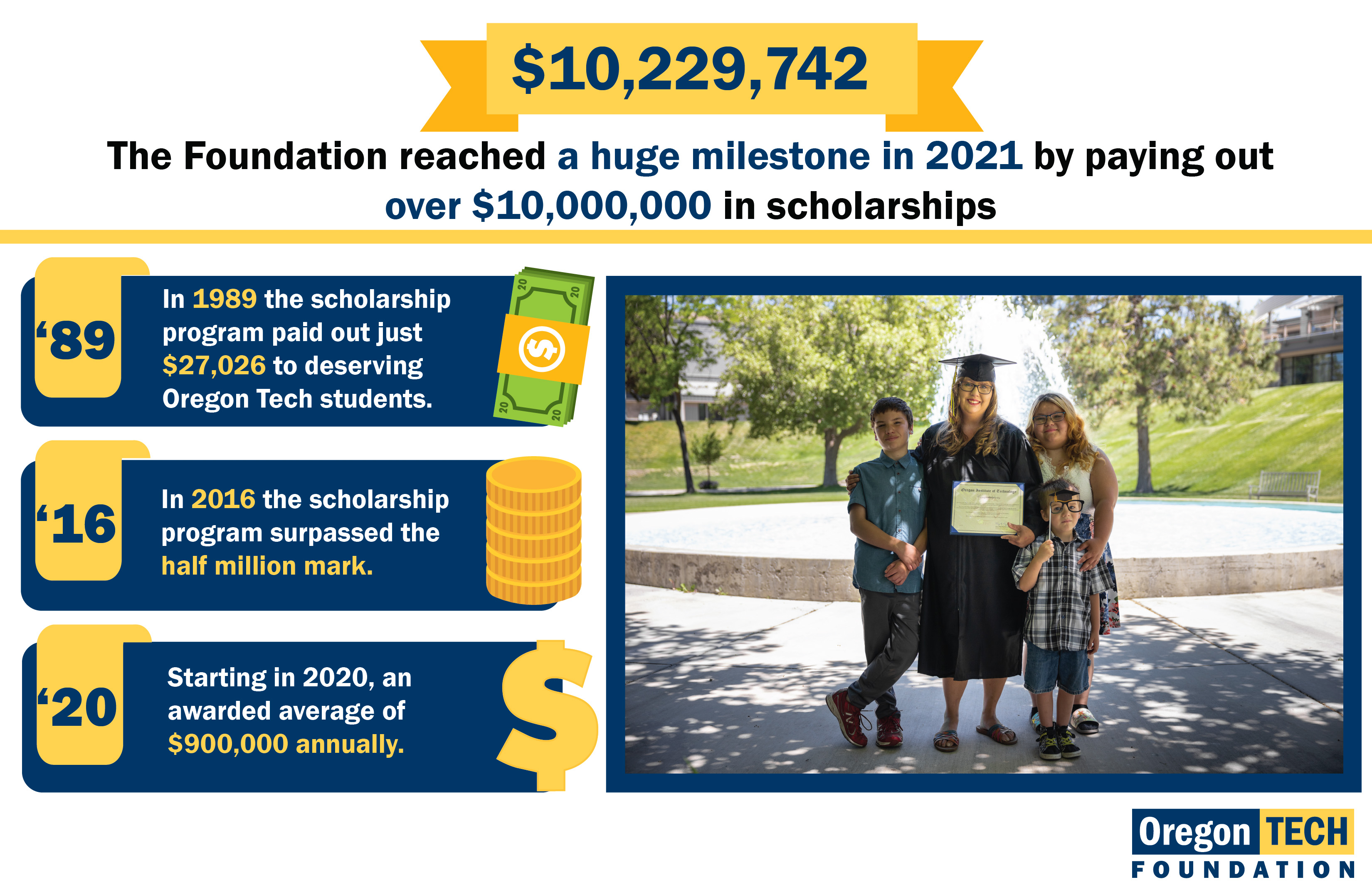 Our job at the Foundation is to support the mission of Oregon Tech, especially students. One of the ways in which we strive to do so is through our scholarship program. What this means for students is that nearly 300 young people will have a brighter future, a boost in morale and a vote of confidence. This milestone is possible through the generosity of individuals, including faculty, staff, alumni, students, industry partners and community members, and foundations, organizations, and businesses who believe in our exceptional students.