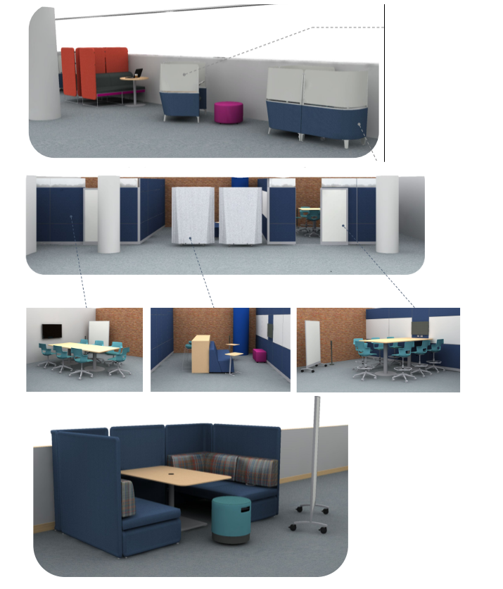 The library was busy this past summer preparing for the returning students. We put the finishing touches on expanding student study space in the library. We created 12,000 extra square feet of space to improve social distancing while they use the library. Later this Fall term, the library will be creating new student group and individual study spaces. This improves and updates furniture for student’s use and includes modern study pods and current technology study spaces so students can collaborate with their teams and with off-campus partners. (See below for renditions).