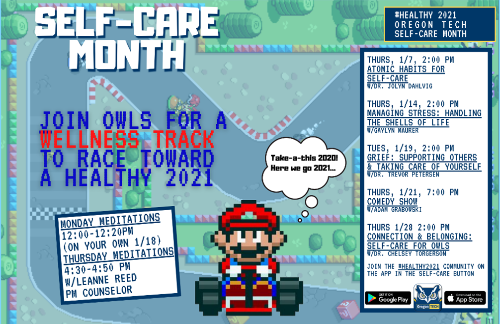 Events included four workshops designed to support holistic wellness, weekly Oregon Tech App posts and wellness suggestions from our community, a virtual comedy show, and guided meditation sessions twice a week.
