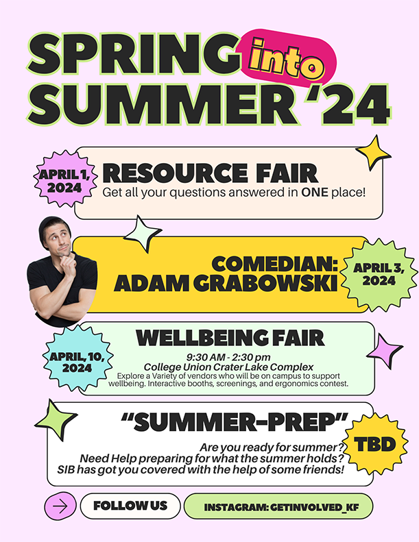 While we are enjoying Winter term we are already looking toward Spring Break and Spring term events. Spring Break will begin March 23, 2024. Student may remain on campus during Spring Break. Housing and Residence Life will be providing shuttles to the Klamath Falls bus or train station. Make sure your student checks their email concerning Spring Break housing and shuttle information. Dining facilities will be closed during the break.