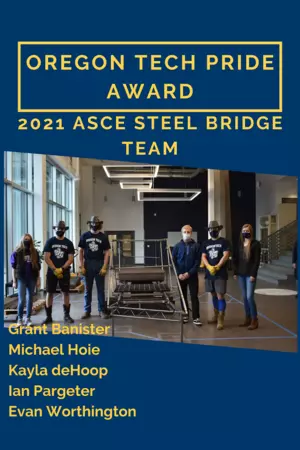 The Oregon Tech Pride Award was established in 2003 by the Student Awards Commission to honor the student or students whose accomplishments bring outstanding recognition and pride to Oregon Tech.