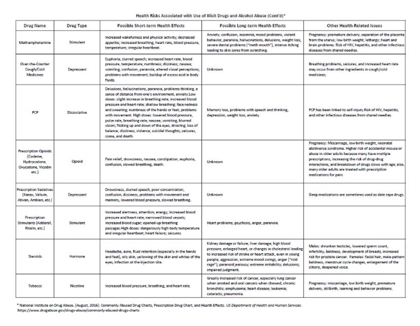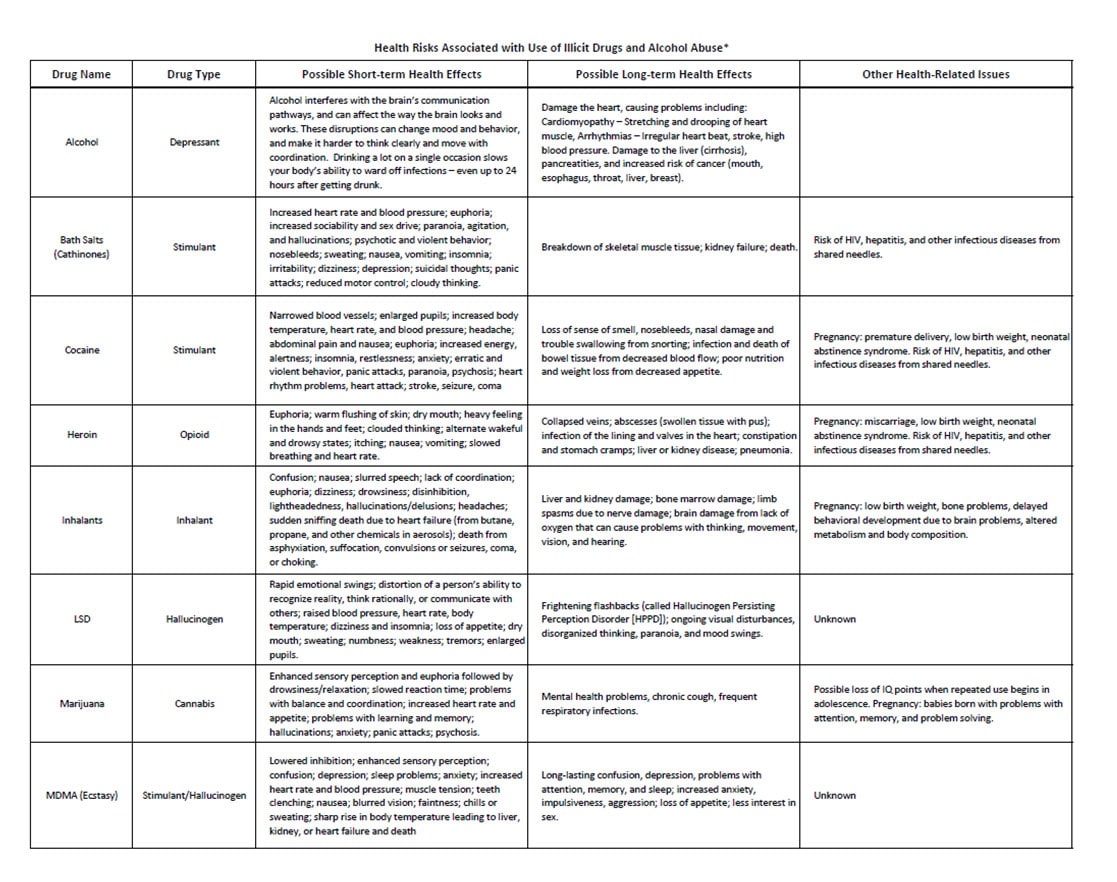 According to the National Institute on Drug Abuse, the following are potential health risks which can occur as a result of drug and alcohol use:
