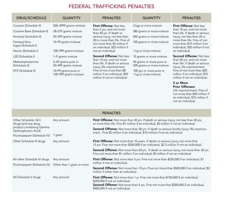 Federal Drug Trafficking Penalties (according to the Drug Enforcement Administration are as follows: