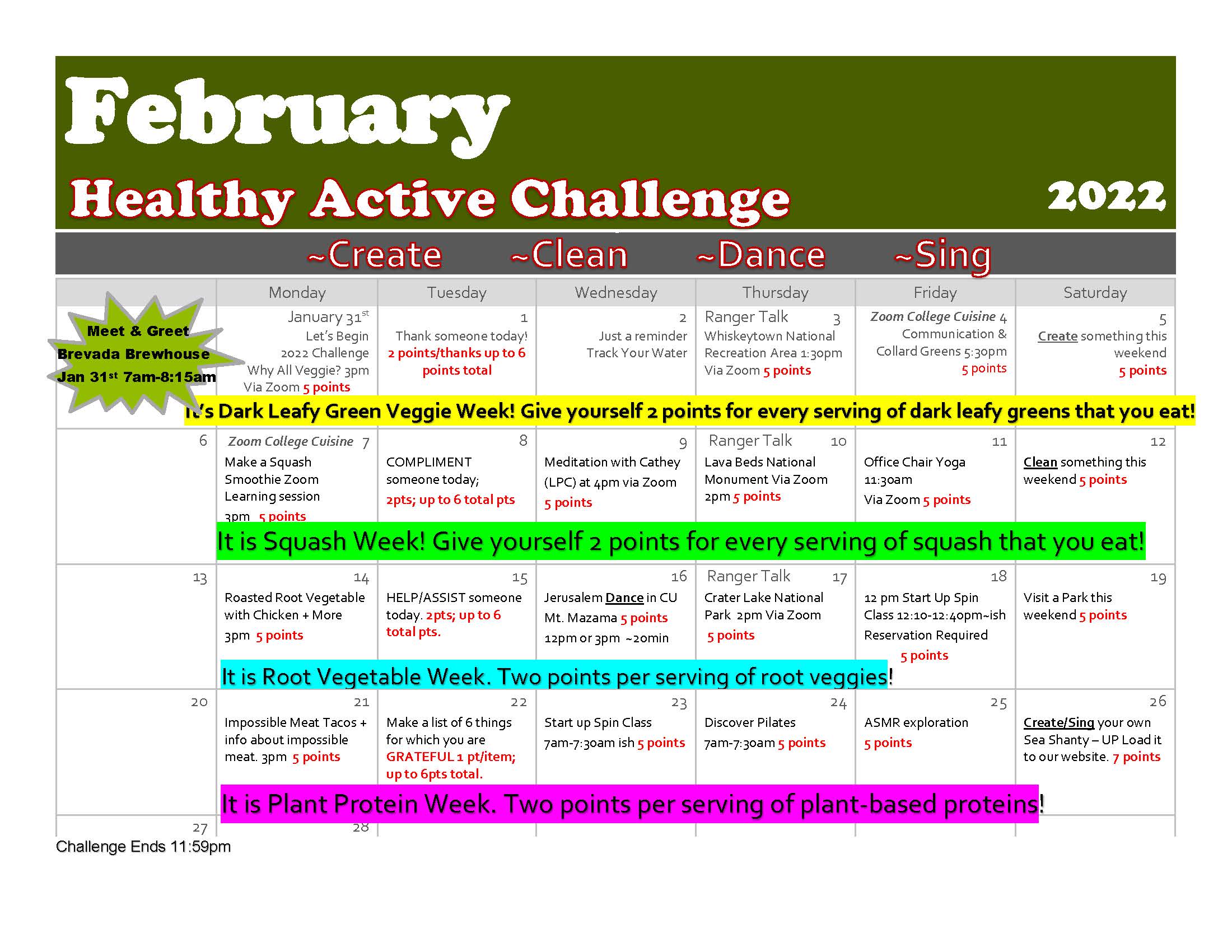 We are excited that you are willing to try to improve your health and fitness this year. This year you will receive a free week at the Tech Rec starting January 28th through February 4th (Use the free weights, cardio machines, and the Functional Trainers. You can easily put together your own weight training routines once you know the basics of each weight/machine. For basic definitions refer to the following website. https://www.garagegymreviews.com/gym-equipment-na) and a free 7-day YMCA Trial Membership(use of all equipment, pool and classes). We will be using a calendar to keep us in track for the 2025 Healthy Active Challenge. Each day we will suggest that you try something new to keep yourself fit, healthy and happy. Every time you do a challenge you will earn points you will record on your scorecard.