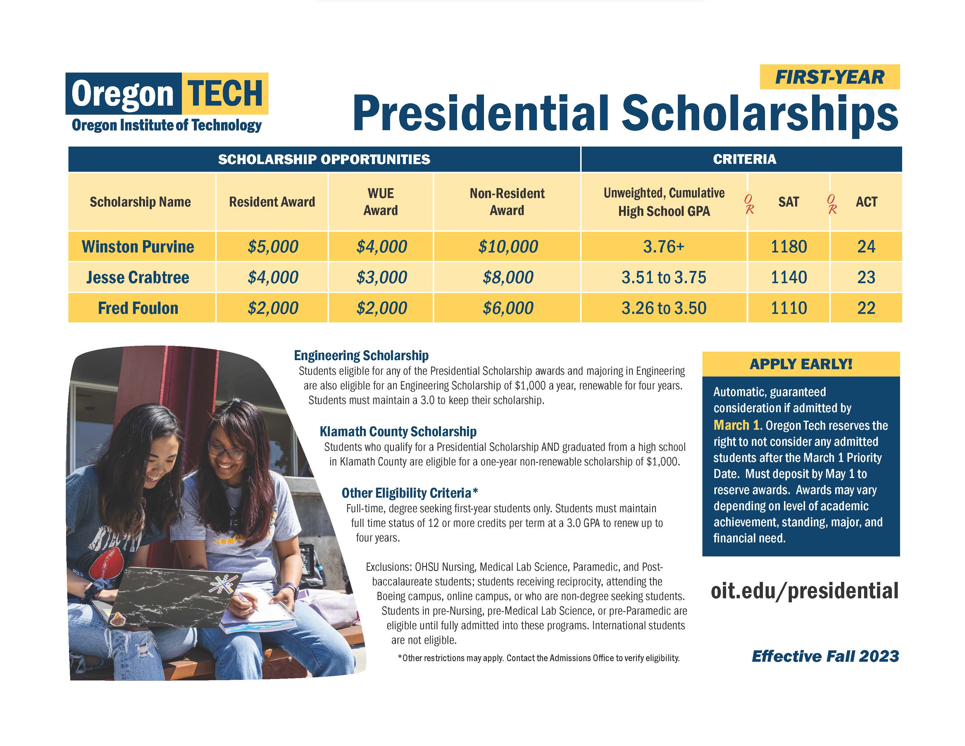 The scholarships are awarded only to new, fully admitted Oregon Tech students in the majors specified above. The only requirement is to apply for admission to Oregon Tech and be accepted for admission by March 1 for enrollment in the following academic year. Applicants must meet all admission requirements in order to qualify.