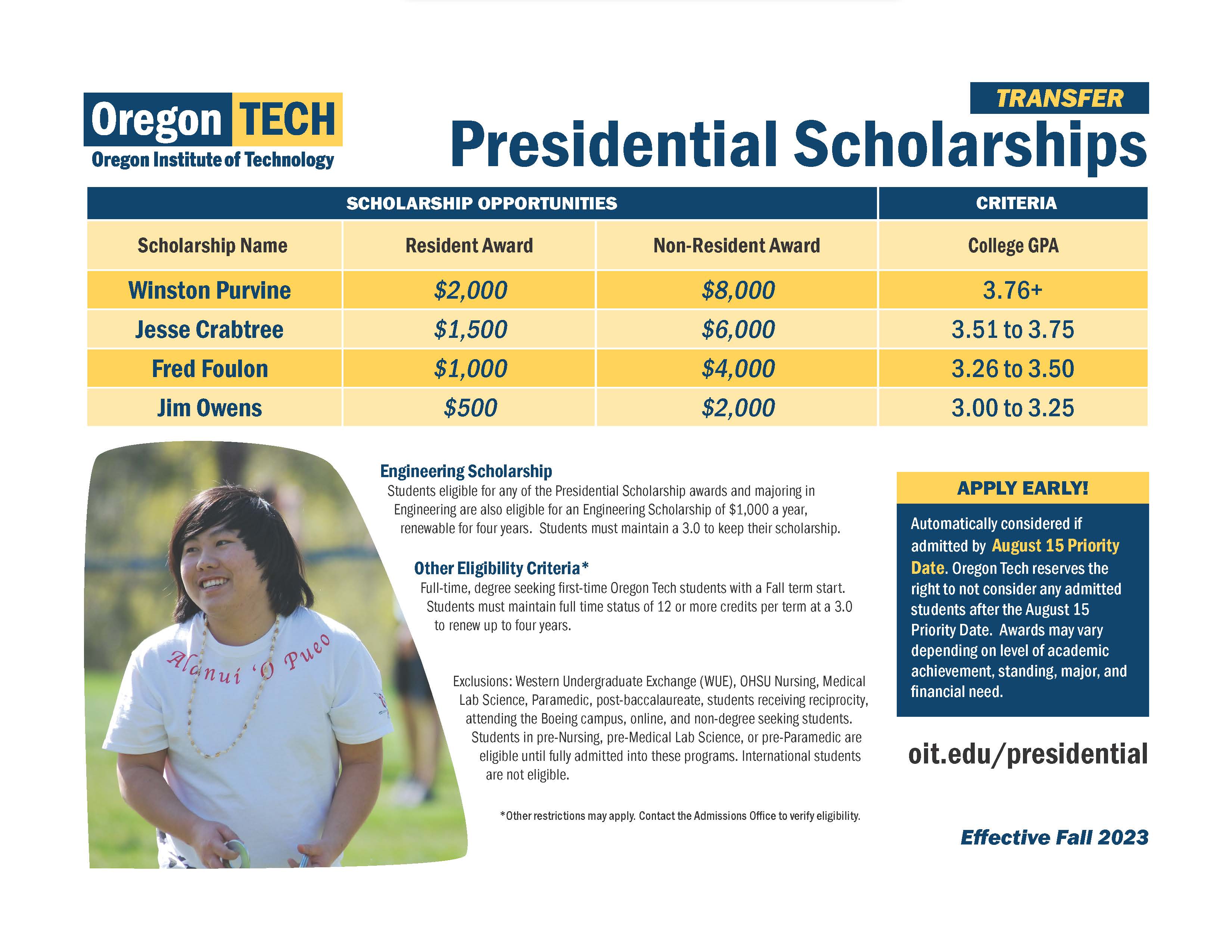 The Engineering Honors Scholarship is for fall, winter and spring terms for four years as long as a 3.0 cumulative GPA is maintained at Oregon Tech and the recipient remains an engineering or engineering technology major. Recipients must carry at least 12 Oregon Tech credits per term. Transfer students must have at least 36 quarter hours of transferable college credit. Applicants with fewer than 36 credits are considered on the basis of their college grades, high school record and test scores.
