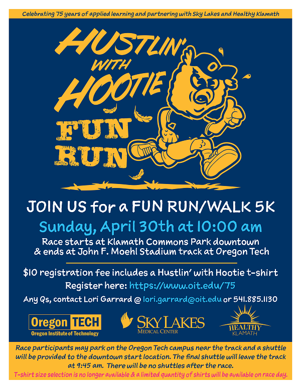 Date: Friday, May 23rd The Oregon Tech Twilight Fun Run is hosted by Oregon Tech Wellbeing in collaboration with the Student Veterans Program, and as part of community Memorial Day events, honors all fallen veterans. Route: The route has been adjusted this year! The Fun Run will begin at Eulalona (formerly known as Kit Carson) Park, proceeding up the trail that runs parallel to Crater Lake Parkway, to El Dorado, up Daggett, and then right on Bryant Williams Way and around campus. Participants have two route options: 1) complete one full loop around campus (5k) or 2) come directly into Moehl Stadium (closer to 2.5k). Professional timing services will be provided by Athletic Timing who track participants with chipped custom bibs. Finish: Food trucks will be located between the stadium and the Athletics Building, with a closing awards ceremony once the top finishers are recorded. Awards will be given for overall finishers and by age group. Registration: Registration fee of $20 will allow participants to run/walk the event, get a t-shirt, and receive one free meal ticket to the food trucks. Registration is online at https://runsignup.com/OITtwilightFunRun. Students and children (up to 18) can participate at no cost, but they DO need to register - be sure to click on the registration for Students and Children. Participants who register the day of the event may not receive a t-shirt, and there will be no cash accepted at Check-in - so be sure to register ahead of time! Details for Participants: This is a family-friendly environment and walkers and runners alike are welcome; the route is paved throughout. Although we love furry friends, dogs or other pets are not allowed (aside from registered service animals). We will have volunteers placed throughout the route ringing cowbells for encouragement, and Klamath Falls police will also assist in traffic control. Hootie (Oregon Tech's mascot) will be joining us, too! Volunteer: We are seeking volunteers to assist with event set-up, check-in, t-shirt distribution, route support, and clean-up. Volunteers will receive an event shirt and ticket to the food trucks! If you'd like to volunteer, go to the registration page (https://runsignup.com/OITtwilightFunRun) and click "Volunteer" at the bottom of the page. If you have any questions please contact Gaylyn Maurer at Gaylyn.Maurer@oit.edu