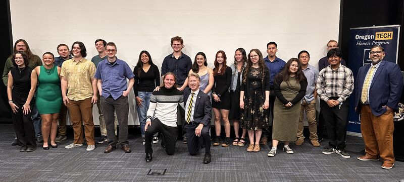 Congratulations to the newest cohort of the Oregon Tech Honors Program! These 21 students are stepping into a program that will challenge and empower them to make meaningful contributions to their careers and communities. This specialized program offers an interdisciplinary education that equips future leaders and professionals with the skills and knowledge to excel in their careers and lead meaningful lives. The Honors Program complements the regular academic curriculum with various extracurricular learning experiences, emphasizing the development of well-rounded professionals, socially responsible individuals, and well-educated students. The students inducted into the Honors Program are: 1. Keanu Delos Santos 2. Sydney Dick 3. Benjamin Kitchell 4. Peter Schram 5. Lucy Koschmann 6. Cruz Collin 7. Sam Lopez 8. Emely Venegas Indalecio 9. Sam Bricker 10. Evan Vazquez 11. Bae-John Waddell Heyneman 12. Vivian Wheeler 13. Nick Heneisen 14. Hari Campos Estevez 15. Logan Shurts 16. Ethan McHugh 17. Sophia Womack 18. Thomas Stoeckl 19. Jordon Hodson 20. Evan Larsen 21. Dulce Hernandez