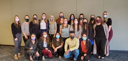 Kneeling L to R: Krista Beaty (faculty), Skyler Hunt, Emily Vahsholtz, Gina Moua, Hasan Alramadan, Kate Martinez, Heather Schudel (faculty), Stacie Neely (instructor).
