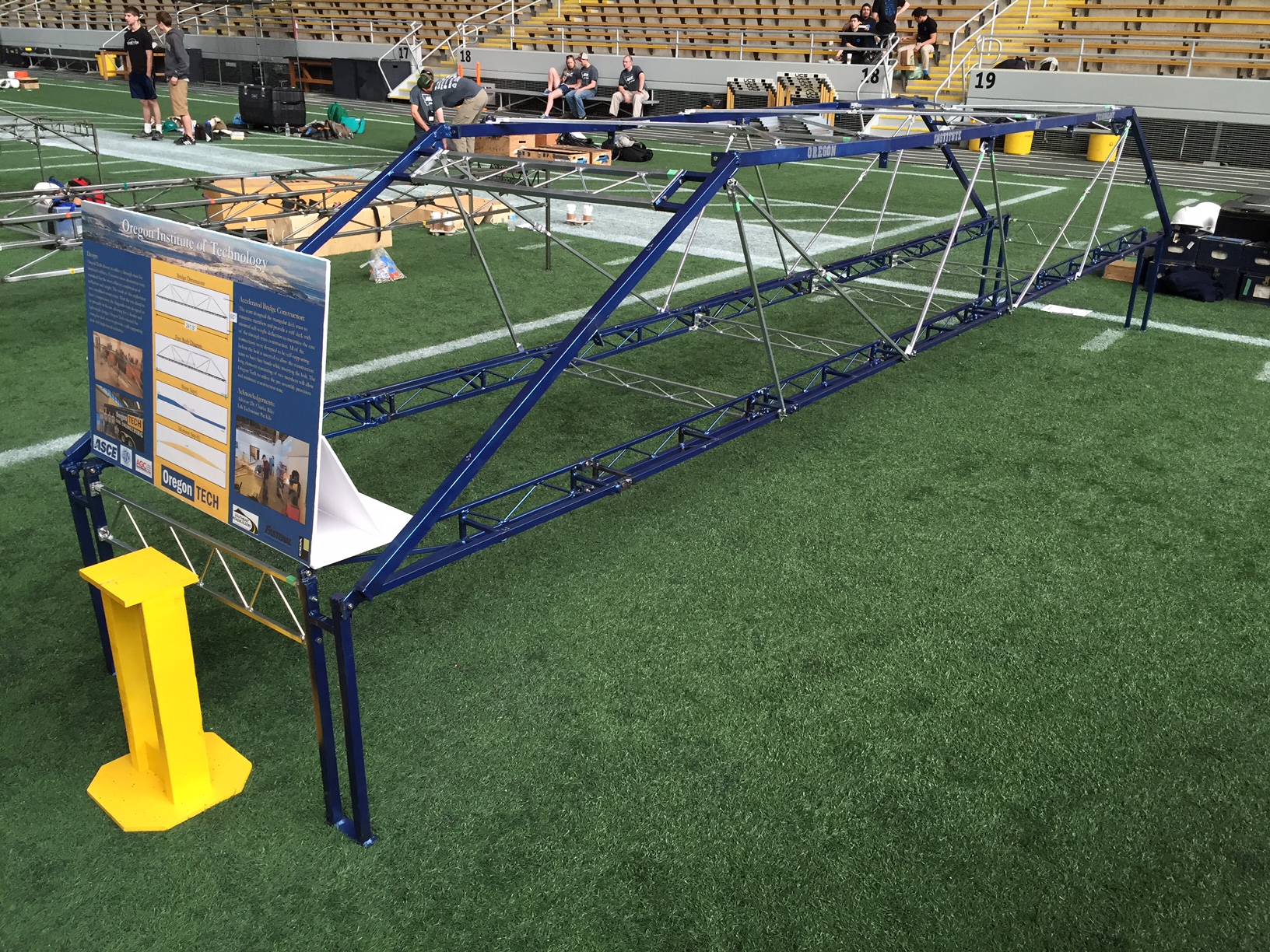 The steel bridge team produced a great design this year but just missed placing in the competition as they were disqualified for a leg too far from vertical during the build. Bridge criteria judges stiffness, construction time, and weight.