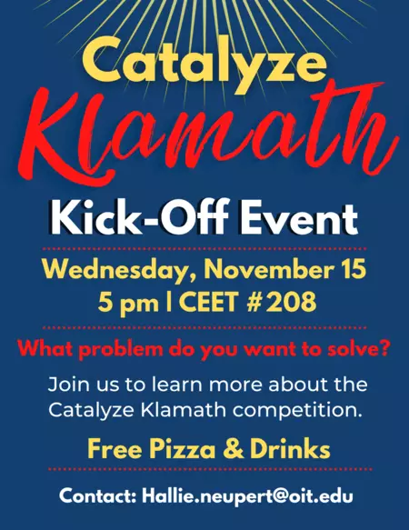 | Catalyze Klamath Falls Challenge Contest | April 23, 2026 | TBD | Teams compete in front of a panel of judges for the PRIZES! A list of judges, prizes and final details will be posted prior to the competition |