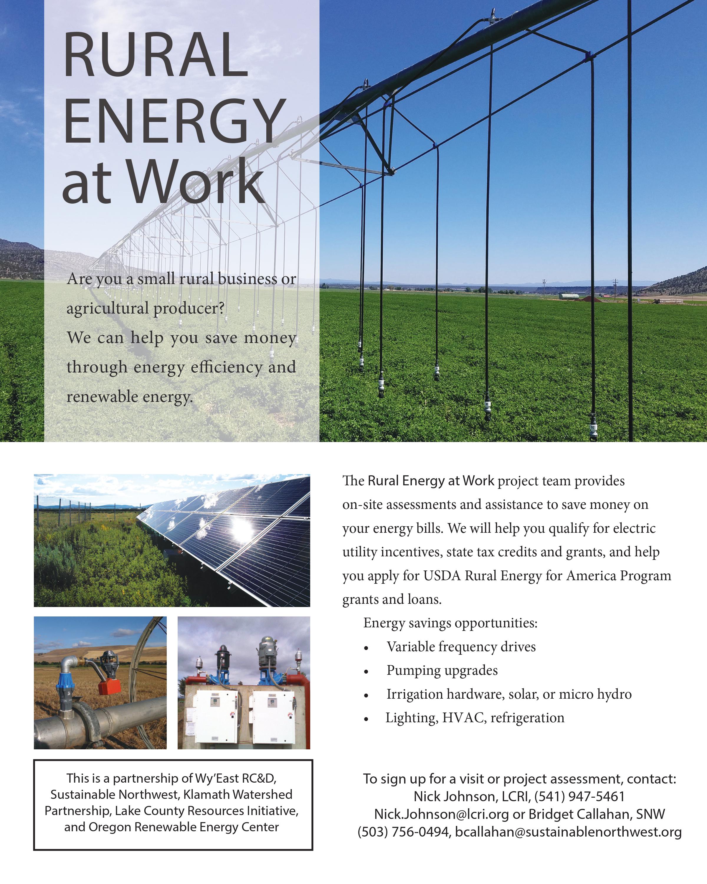 USDA Energy Audit funding for the “Rural Energy Works for Oregon and California” project will deliver energy audits to rural small businesses and agriculture producers in Klamath, Lake and Harney counties in Oregon, and Modoc County in California. Regional organizations leading this effort include: Oregon Tech/Oregon Renewable Energy Center (OREC), Lake County Resources Initiative (LCRI), Sustainable Northwest (SNW), Klamath Watershed Partnership (KWP) and Wy’East RC&D (Wy’East). It will combine the respected engineering expertise of Wy’East, project administration of OREC, program management of SNW, as well as the previous relative experience and network of contacts each organization has developed, to provide energy audits that spur action across the region. “The audits will increase the energy awareness of Oregon and California’s rural communities and provide opportunities for improvements in efficiency and renewable energy generation,” said Dr. Terry. If you are a rural small business or agricultural producer interested in energy audits leading to energy efficiency or renewable energy solutions for your farm or business. For questions or more information, contact Dr. Mason Terry (mason.terry@oit.edu) or Jennifer Berdyugin (jennifer.berdyugin@oit.edu).