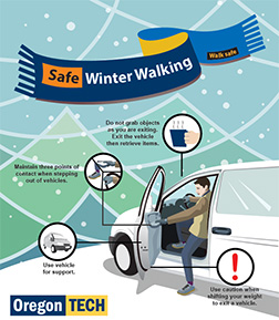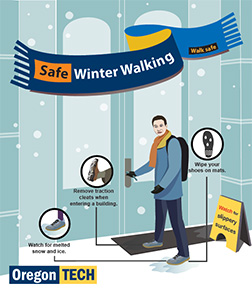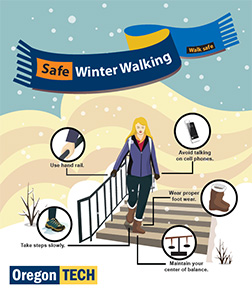 During these snowy and icy weather conditions Oregon Tech would like to remind everyone to be safe while on campus. No matter how well the snow and ice are removed from campus sidewalks, parking lots and the surrounding streets, people will invariably encounter some slippery surfaces when walking outdoors in the winter.