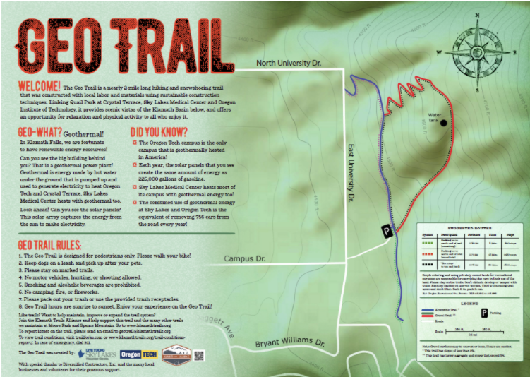 The Geo Trail is a 2-mile hiking and snowshoeing trail linking Quail Park at Crystal Terrace, Sky Lakes Medical Center and Oregon Institute of Technology.