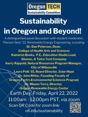 A distinguished panel discussion with student moderator, Pierson Gest '22, Renewable Energy Engineering, including: Dr. Dan Peterson, Dean, College of Health Arts and Sciences, Kameron Beeks, P.E., Education Studio Lead, Glumac A Tetra Tech Company, Kerry Rappold, Natural Resources Program Manager, City of Wilsonville, Laura Polk '15, Board Director, Solar Hope, Dr. John Ritter, Founding Faculty Oregon Tech's Environmental Sciences Program, and Dr. Mason Terry, Director, Oregon Renewable Energy Center
